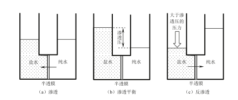 當一張半透膜隔開溶液與純溶劑時,加在溶液上并使其恰好能阻止純溶劑進入溶液的額外壓力稱之為滲透壓,通常溶液中溶質的濃度越高滲透壓就越大。當溶液一側沒有加壓時,純溶劑會通過半透膜向溶液一側擴散,這一現象稱為滲透。反之,如果加在溶液側所加壓力超過滲透壓,則反而可以使溶液中的溶劑向純溶劑一側流動,這個過程就叫反滲透。反滲透膜分離技術就是利用反滲透原理分離溶質和溶劑的方法。
